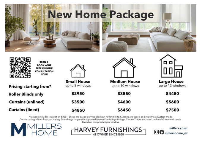 *Package includes installation & GST. Blinds are based on our Essentials Range Blockout Roller Blinds. Curtains are based on Single Pleat Custom-made.